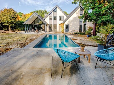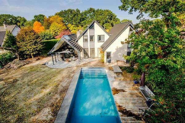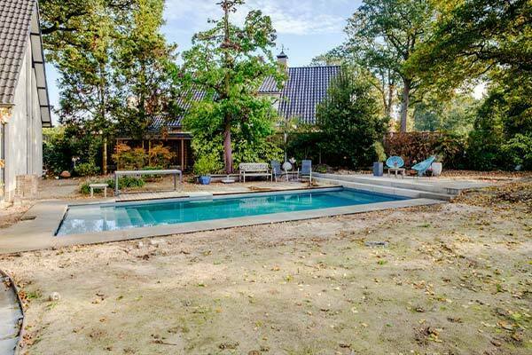 De wens van de klant was een strak zwembad met zuivering zonder chemicaliën. Dit strakke zwembad zuivert geheel natuurlijk d.m.v. een mineralenfilter en een phostec filter. De natuurlijk kleur van het water word gecreëerd door de blauw/grijze kleur van het bad. Een rolldeck zorgt voor een natuurlijke opwarming in de zomer en een bescherming tegen vuil. Rondom het zwembad ligt een Oud Hollands zwembadrand in de lichtgrijze kleur.