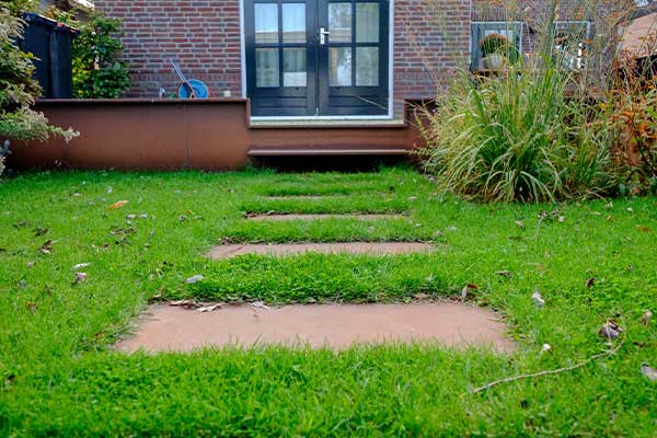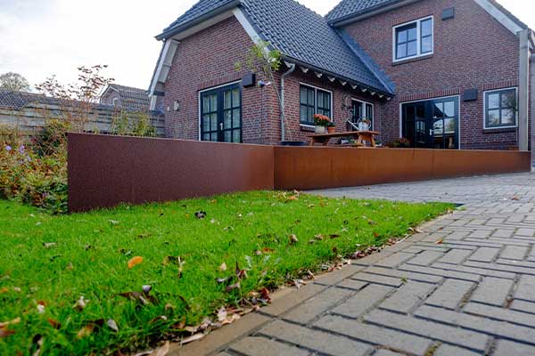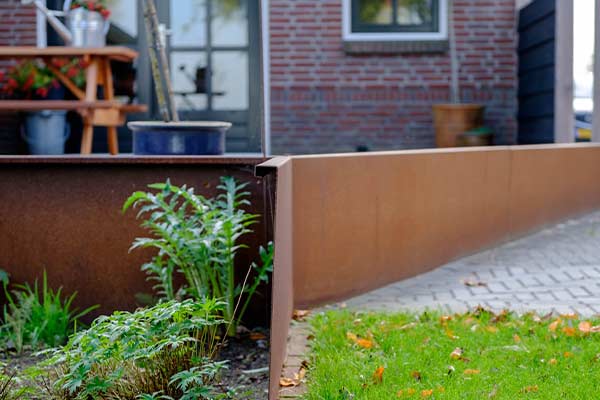 In deze tuinrenovatie is gebruik gemaakt van het natuurlijke product cortenstaal. Dit is een metaal wat d.m.v. weersinvloeden roest en niet afgeeft. Om een hoogteverschil op te vangen tussen het terras en de rest van de tuin, hebben we een wand geplaatst van cortenstaal. Met vaste traptrede zodat vanuit het terras een toegang is naar de tuin. In het midden van de tuin is een overkapping geplaatst met Oud Hollandse tegels. Naar de overkapping toe lopen stapstenen van cortenstaal.